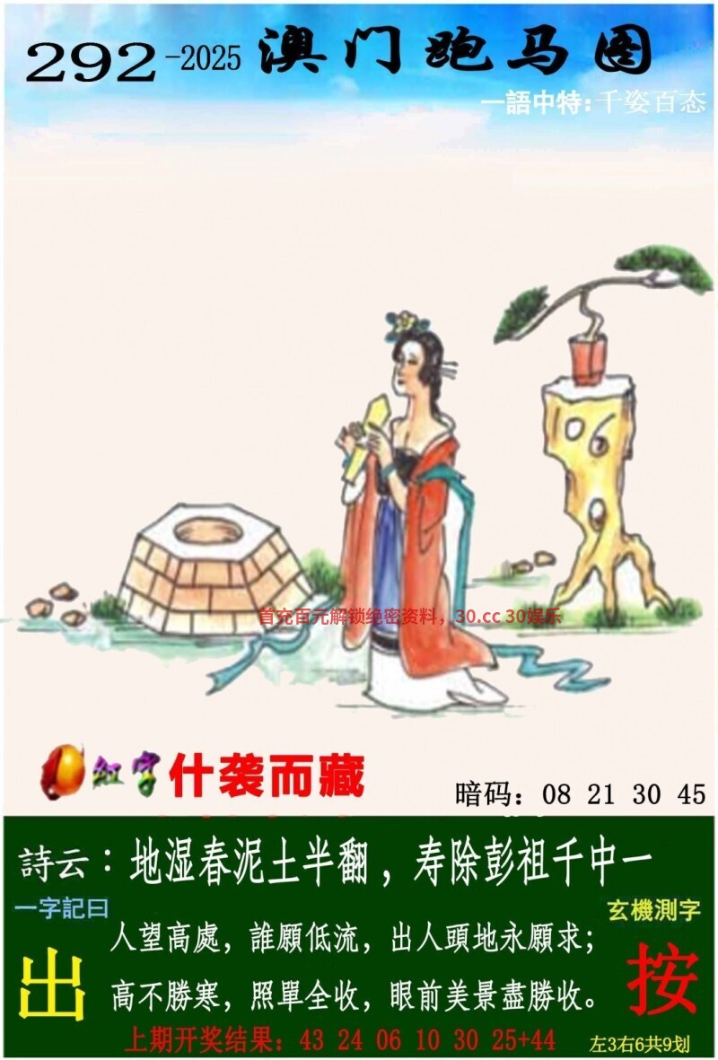 295期一字記曰:【傲】 金玉其表,傲然挺立;写绰约天外无余。孤芳自赏,自作多情!回看尘土似前生。【惘】 解:写绰约天外无余:天外解天肖猪马猴牛兔龙 综合取肖:猪马猴牛兔龙 |